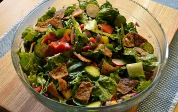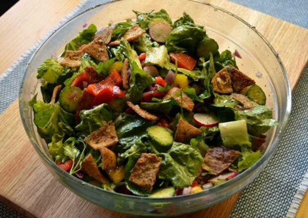 Фатуш - летний салат из свежих овощей и обжаренного хлеба. Очень простой в приготовлении и невероятно вкусный, он является представителем традиционной арабской кухни. Чаще всего создание его рецепта приписывают жителям Ливана, Сирии и Ирака. Фатуш настолько легкий, что съедается моментально, поэтому я всегда готовлю побольше, но данный рецепт рассчитан на 2-3 порции, однако если вы точно уверенны, что вам и вашей семье это блюдо придется по вкусу, смело умножайте все количество ингредиентов на два.